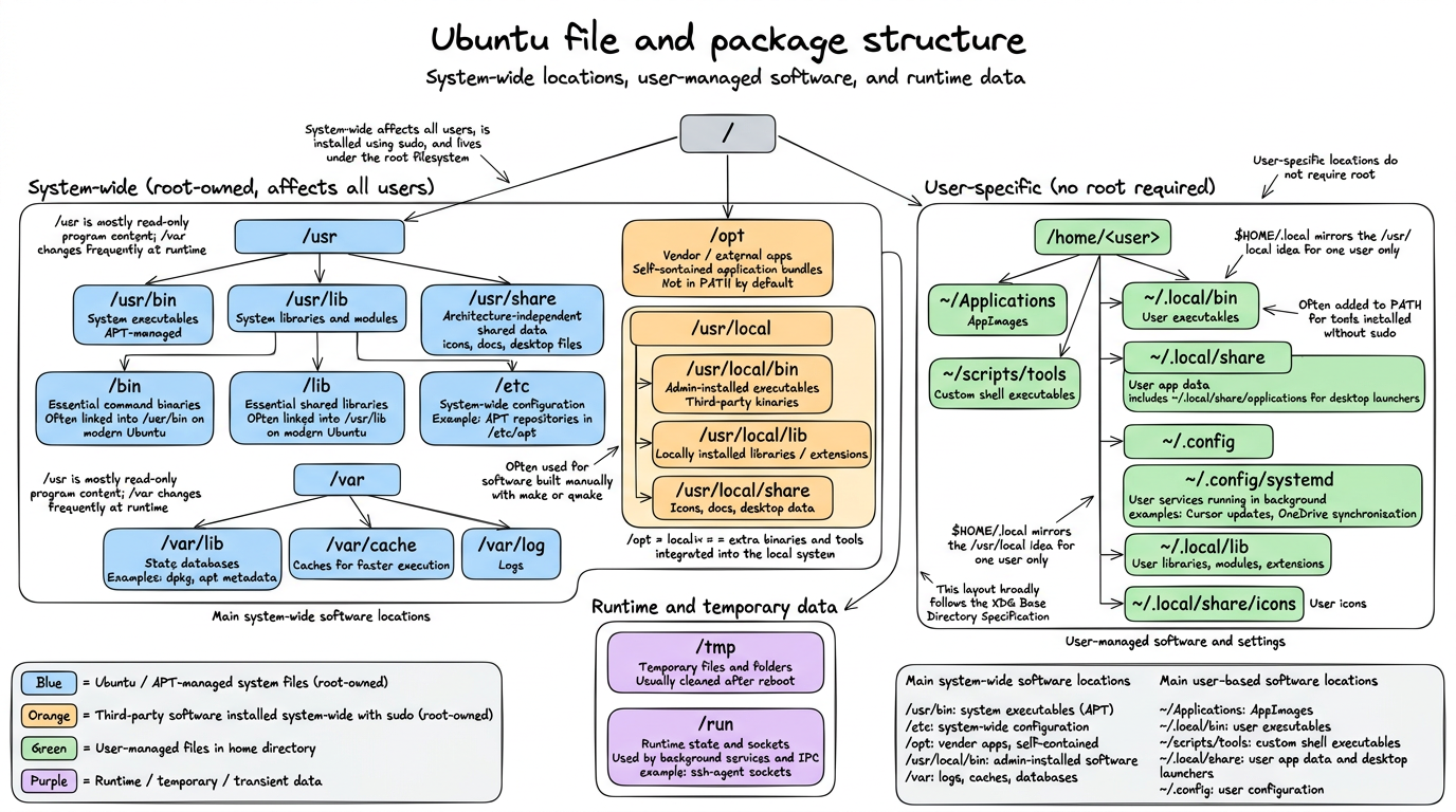 /usr, and manual installs under/usr/localare in the$PATHby default- For third-party GUI, self-contained apps stored under